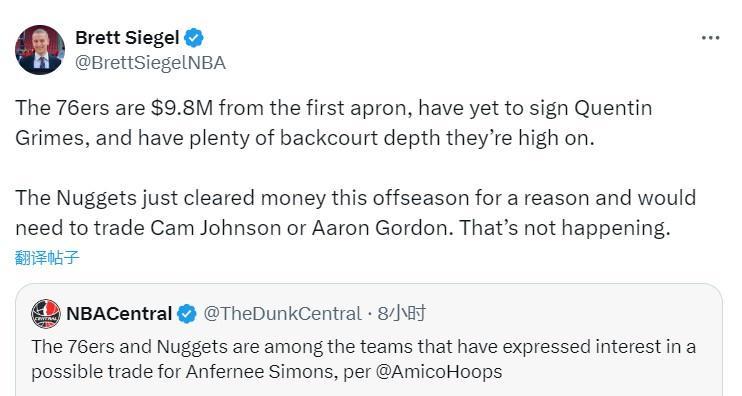 “掘金今年夏天降低薪资是有原因的,要引进西蒙斯他们需要交易卡梅隆-约翰逊或者阿隆-戈登。他们不会这么做。”