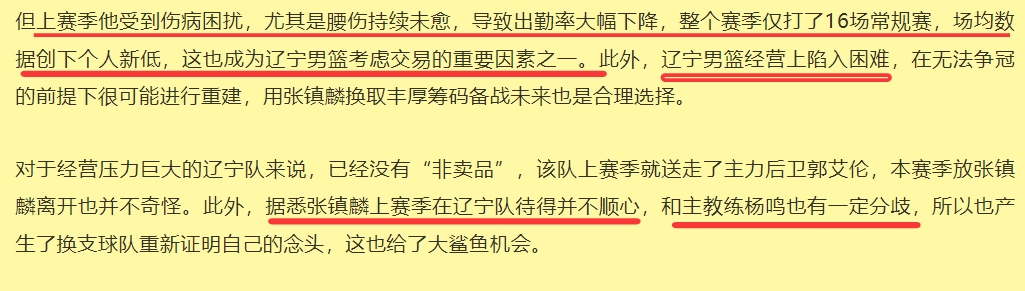 更过分的是,还捏造辽篮俱乐部在经营上陷入困境,不得不通过卖掉非常值钱的球星张镇麟的方式断臂求生,缓解眼前的困难。